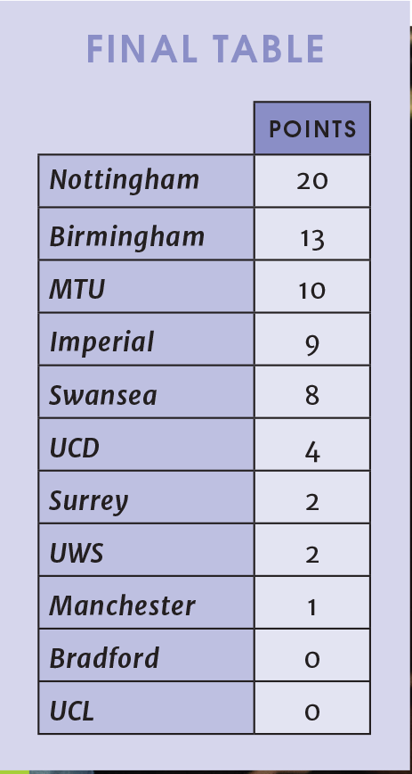 Nottingham swept to victory, scoring points in seven of the nine events including basketball, netball and relay, taking home the title for the first time since 1986. They handily beat their nearest rivals Birmingham, who have dominated the competition in recent years, winning eight of the last ten titles.
