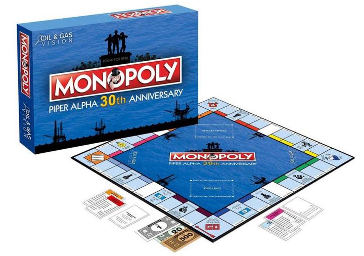 The classic board game has been transformed into an oil-themed edition by fundraisers, with each square on the board sponsored by companies working in North Sea oil. The game is being sold for £34.99 (US$49.50) to raise funds to maintain a memorial to Piper Alpha in Hazlehead Park in Aberdeen.