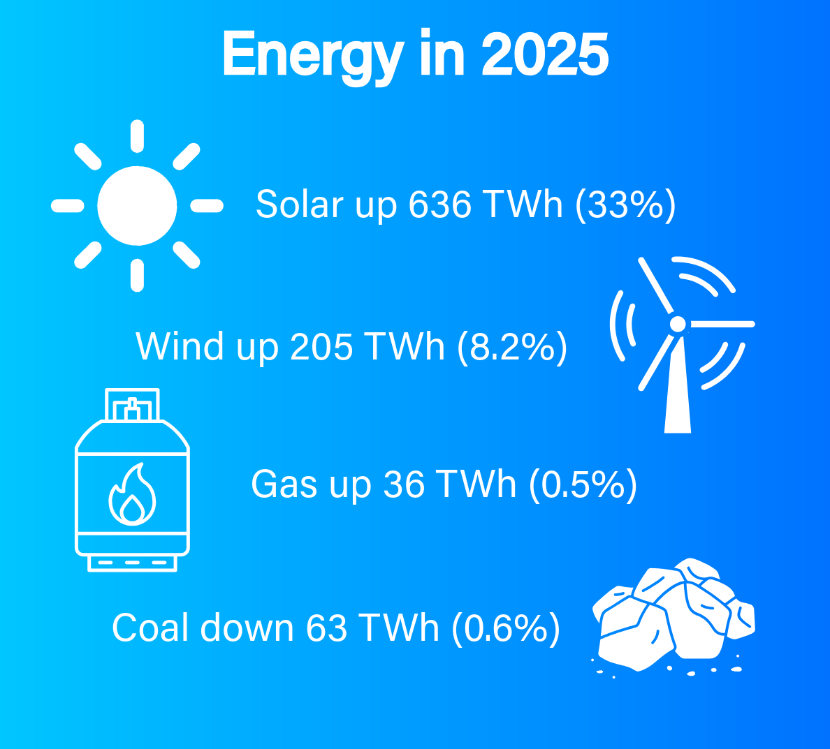 Wind also experienced a surge, with 205 TWh generated. China again led the way (138 TWh), ahead of India (22 TWh).