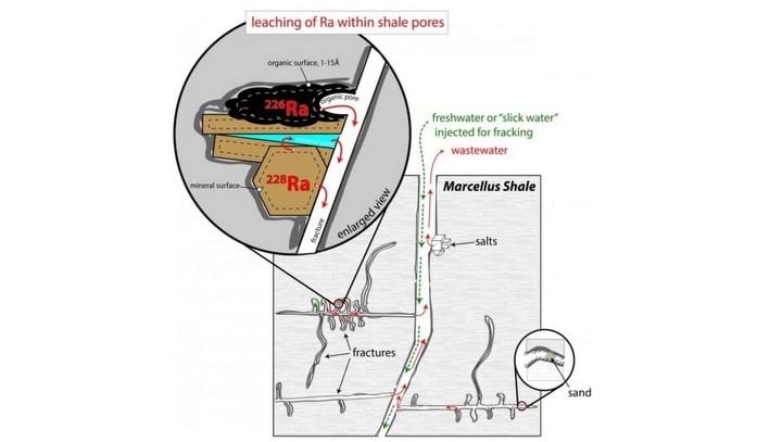 “To reproduce the Ra isotopic composition of wastewaters we require release of Ra from a second phase, an exchangeable phase of the rock. This occurs by sorption-desorption reactions between the increasingly saline fracking fluids and the rock within the shale pore network.”